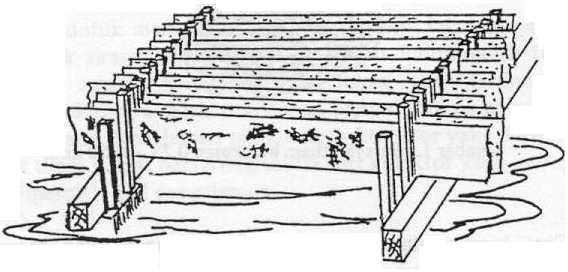 Rakit terbuat dari batang-batang bambu atau kayu dengan tong plastik atau drum sebagai penyangganya.
