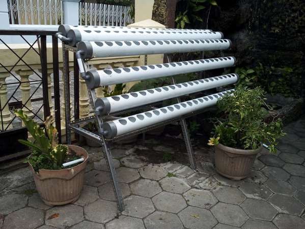 1) pipa pralon, (2) gelas-gelas plastik untuk wadah tanaman, (3) kerangka besi, (4) wadah air besar (ember besar), (5) media tanam—tanah, (6) selang air, (7) skrup untuk penyusunan kerangka besi, (8) pompa air elektrik, serta (9) bibit tanaman. Sementara alatnya meliputi bor untuk melubangi pralon.