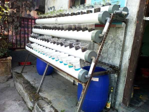 (1) menyusun kerangka besi berundak dengan ukuran instalasi 2,5 x 1 m, (2) melubangi pipa seukuran diameter gelas plastik yang digunakan, (3) menyusun pipa pralon di instalasi besi, (4) menghubungkan pipa dengan saluran air (ember), keseluruhan pipa yang dipasang terhubung satu dan yang lainnya, (5) memasukkan media tanam dalam gelas, (6) menanam bibit yang sudah disediakan.