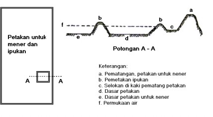 PENEBARAN (PENANAMAN, STOCKING)Petakan untuk aklimatisasi (ipukan) perlu dibuat, atau bila telah ada perlu disiapkan dengan baik. Pematangnya diplester (dilapisi) dengan tanah yang lunak dan sekalian menutupi bocoran-bocoran. Atap diperlukan yang biasanya dibuat dari kisi-kisi bambu (kere) untuk memberikan kesejukan kita dapat memanfaatkan cabang-cabang dari pohon api-api yang baru dipotong, seperti daun kelapa, daun nipah diletakkan di aasnya sebagai atap (dapat digunakan daun nipah atau daun kelapa yang dibuat khusus untuk atap). Ada juga yang ditancapkan pada keliling ipukan dapat, agar memberikan