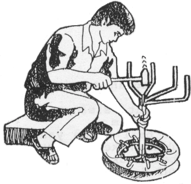 Tangkupkan kedua lingkaran ban yang bagian dalamnya berada di sebelah luar. Pasang besi-besi yang berbentuk U dan V seluruhnya. Kemudian ujung-ujung besi U dipasang ke dalam pipa besi. Setelah itu pantek dengan paku supaya kuat, seperti Gambar 1