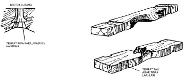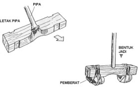 Supaya ujung pipa melebar, panaskan diatas api. Tusuk kayu bulat yang runcing pada lubang pipa, agar waktu tali berputar dapat bergerak dengan lancar. Kemudian rakit pipa di antara 2 papan yang diikat dengan tali plastik (Gambar 6)