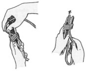 Untuk membuat simpul gunakan alat bantu berupa belahan bambu. Jarak antar simpul 25-35 cm. Jumlah simpul disesuaikan dengan panjang tali/kedalaman sumur. (Gambar 7 dan 8).